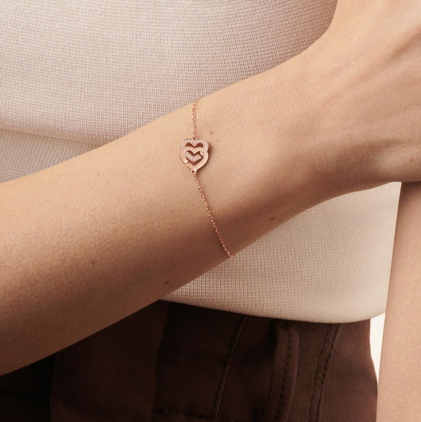 Des créations signatures où deux cœurs s’entrelacent avec simplicité et modernité. Pendentifs, bracelets et puces d’oreilles.